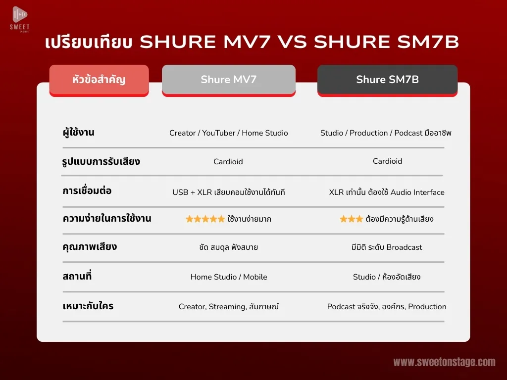 • SM7B: Dynamic / ต้องใช้ XLR + Audio Interface (หรือ preamp) / กันเสียงรอบข้างดี